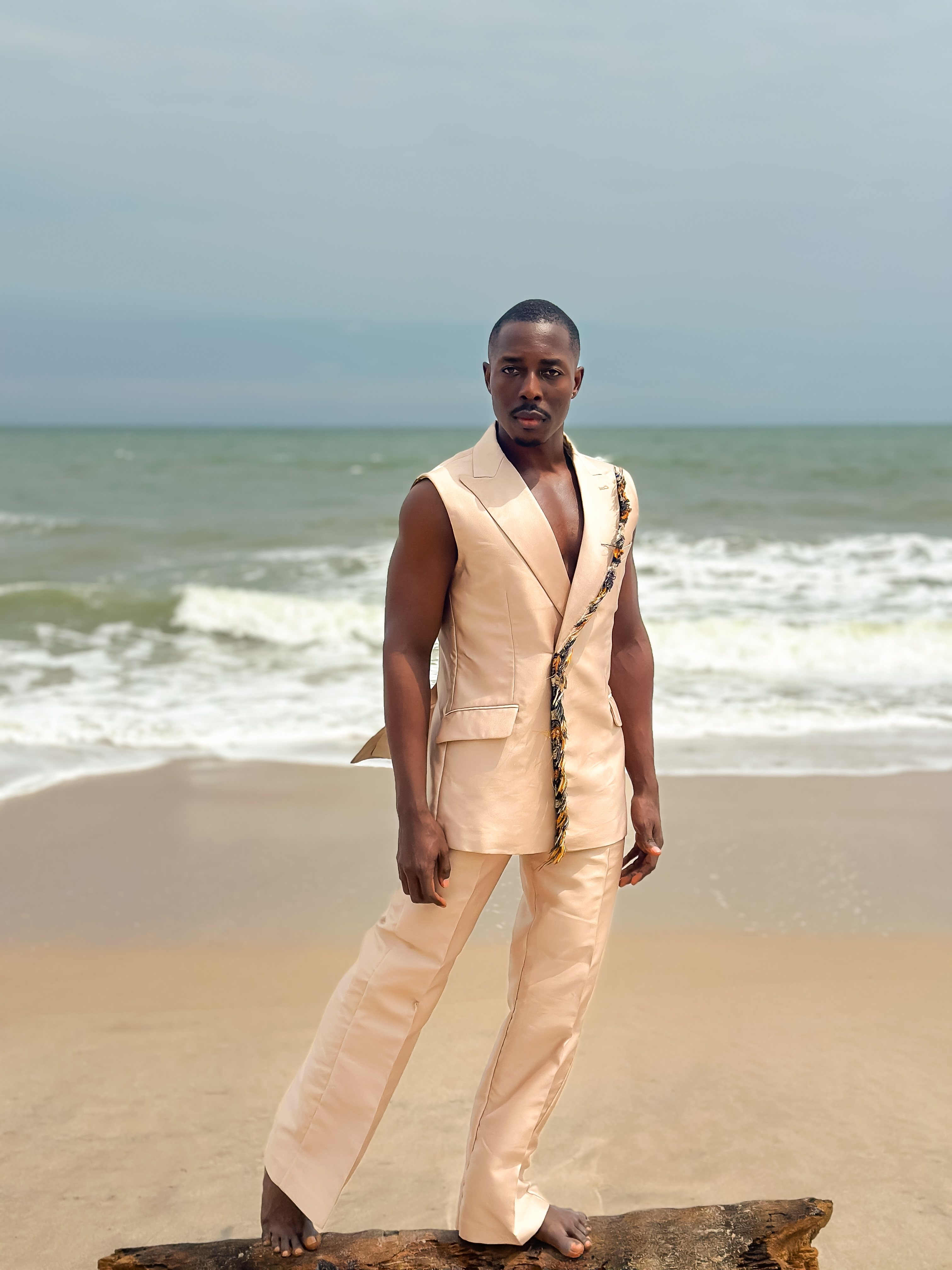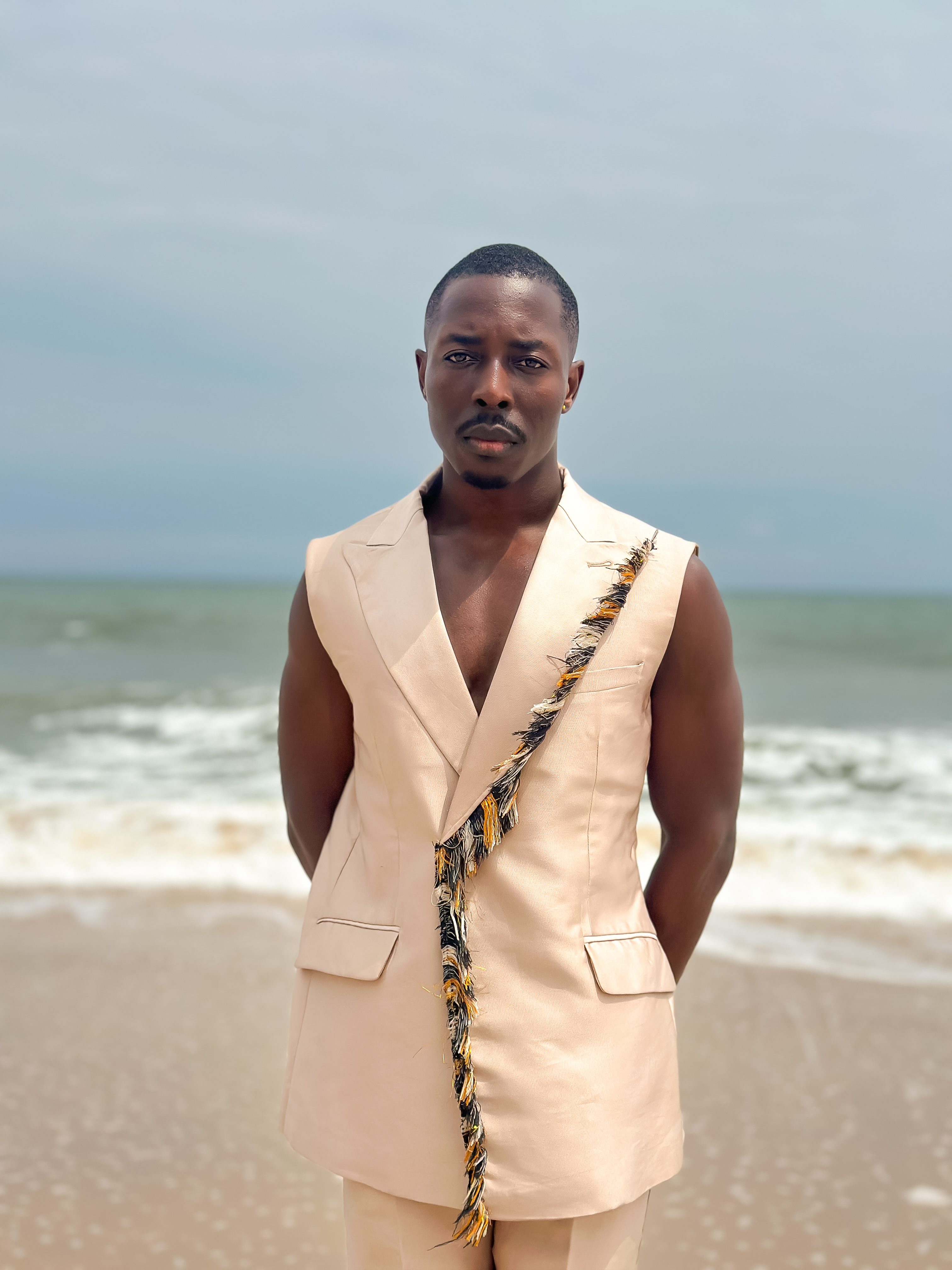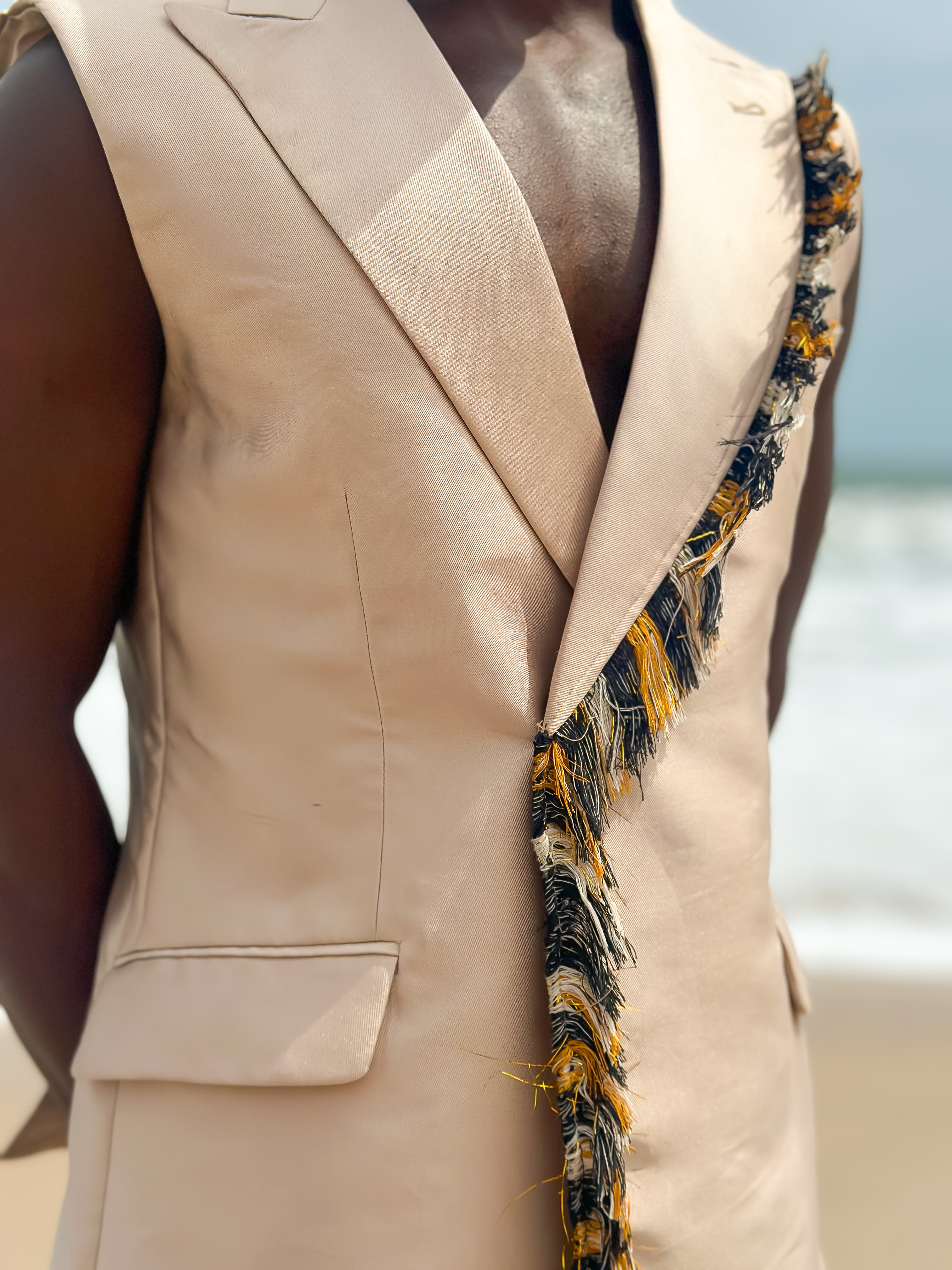 Sleeveless peak lapel jacket, detailed with hand made fringes from our signature asooke across lapel downwards paired with a hybrid straight pant.