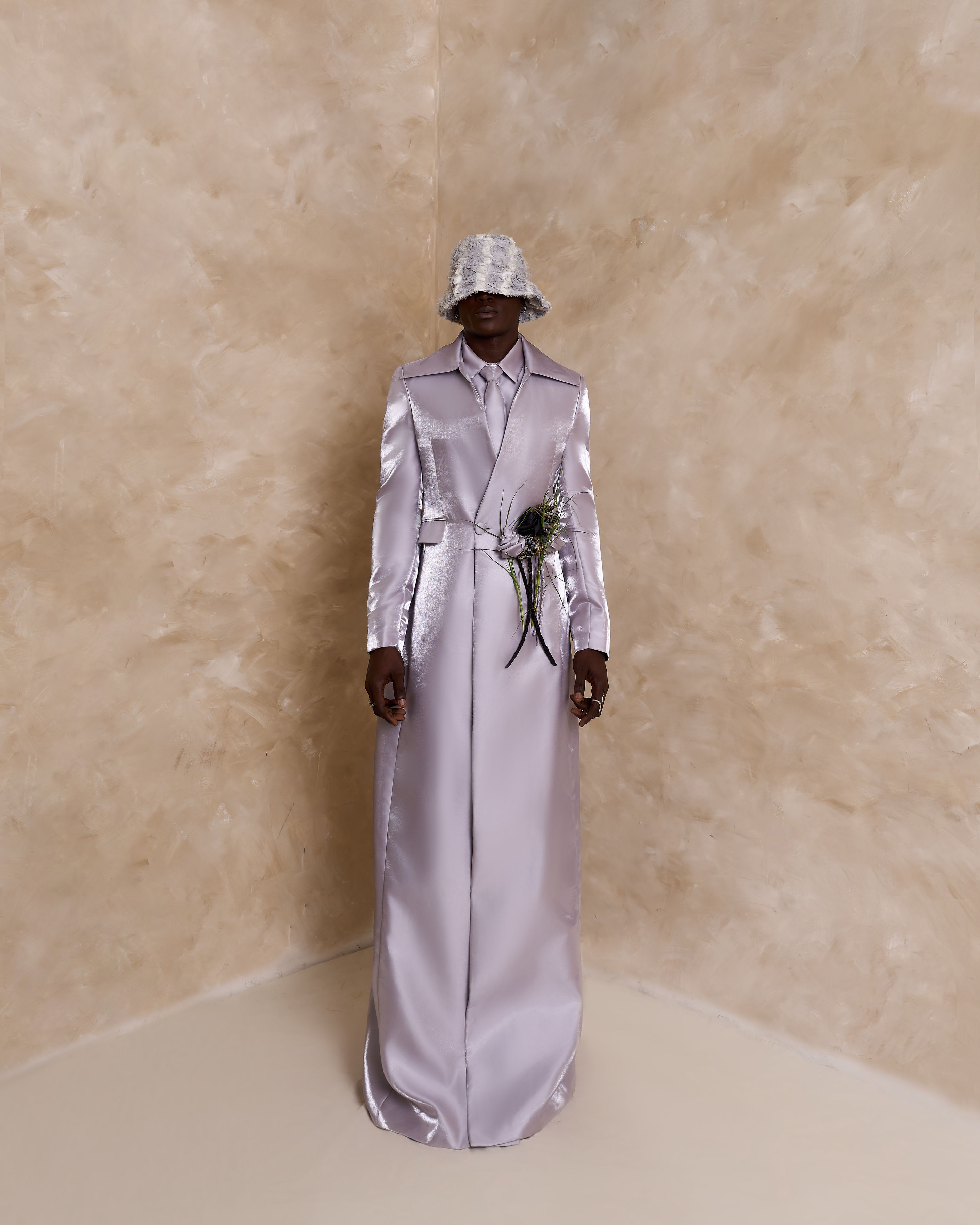 Monochrome full lenght double breasted trench coat, designed with a 3 piece handmade rose bouquet & long thin leaves. Sleeveless inner shirt, tie and pant.