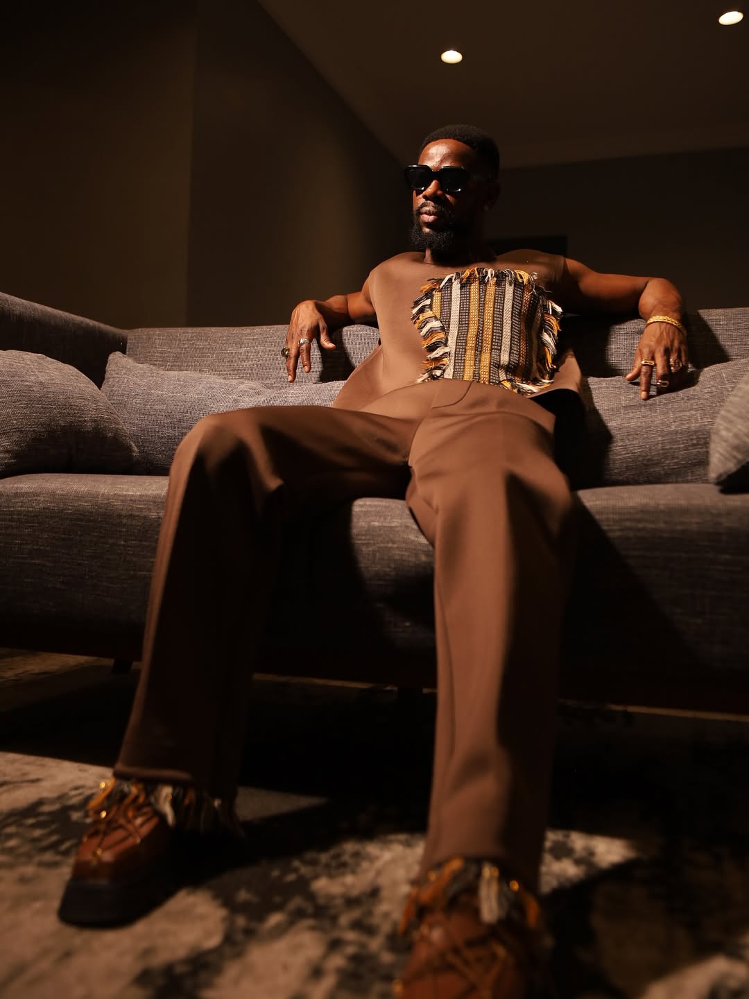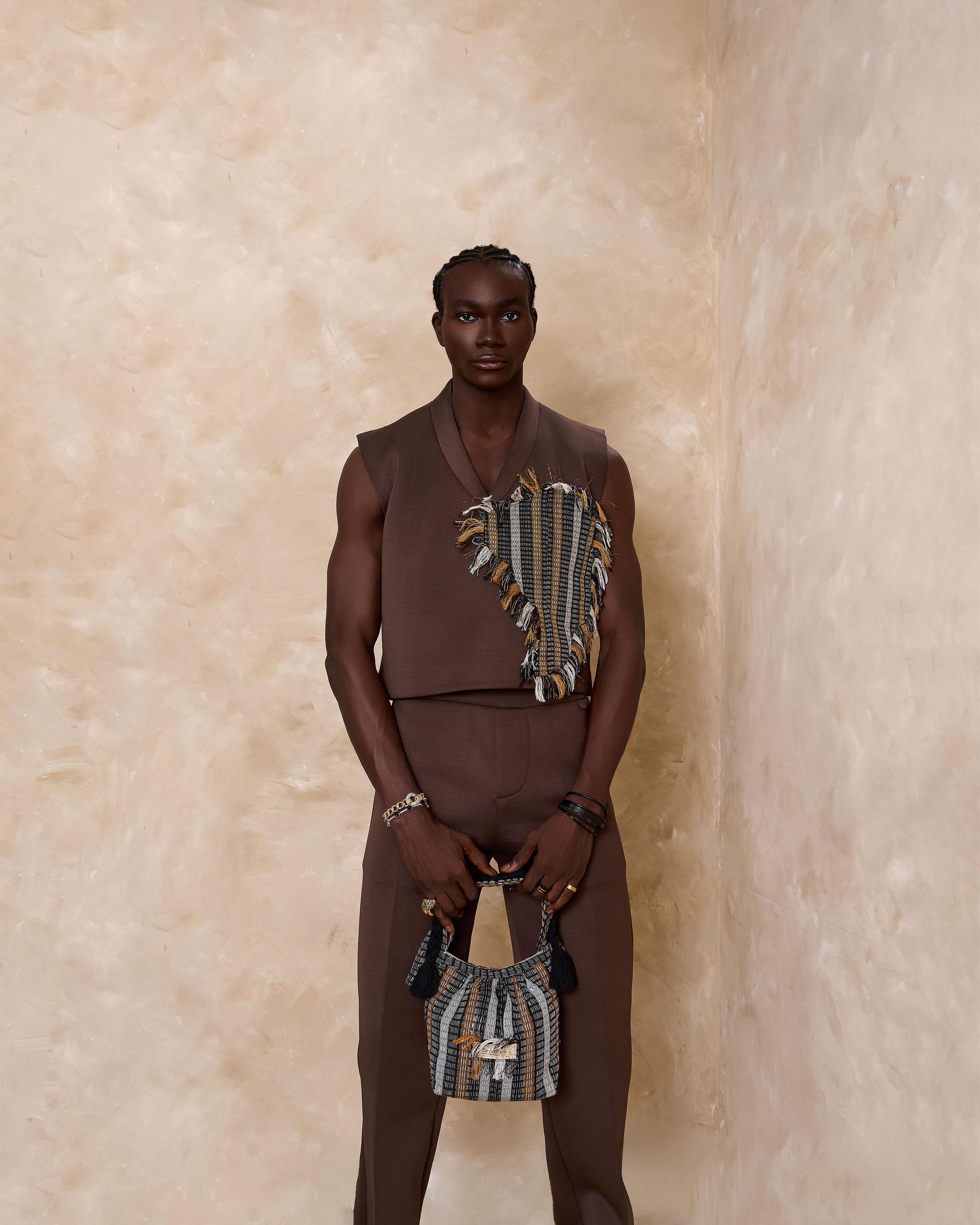 Sleeveless V-neck hybrid top, designed with the map of Africa depicted with asooke & asooke made fringe details at the edges. Paired with a hybrid Wide leg pant and asooke fringe details at the helm.