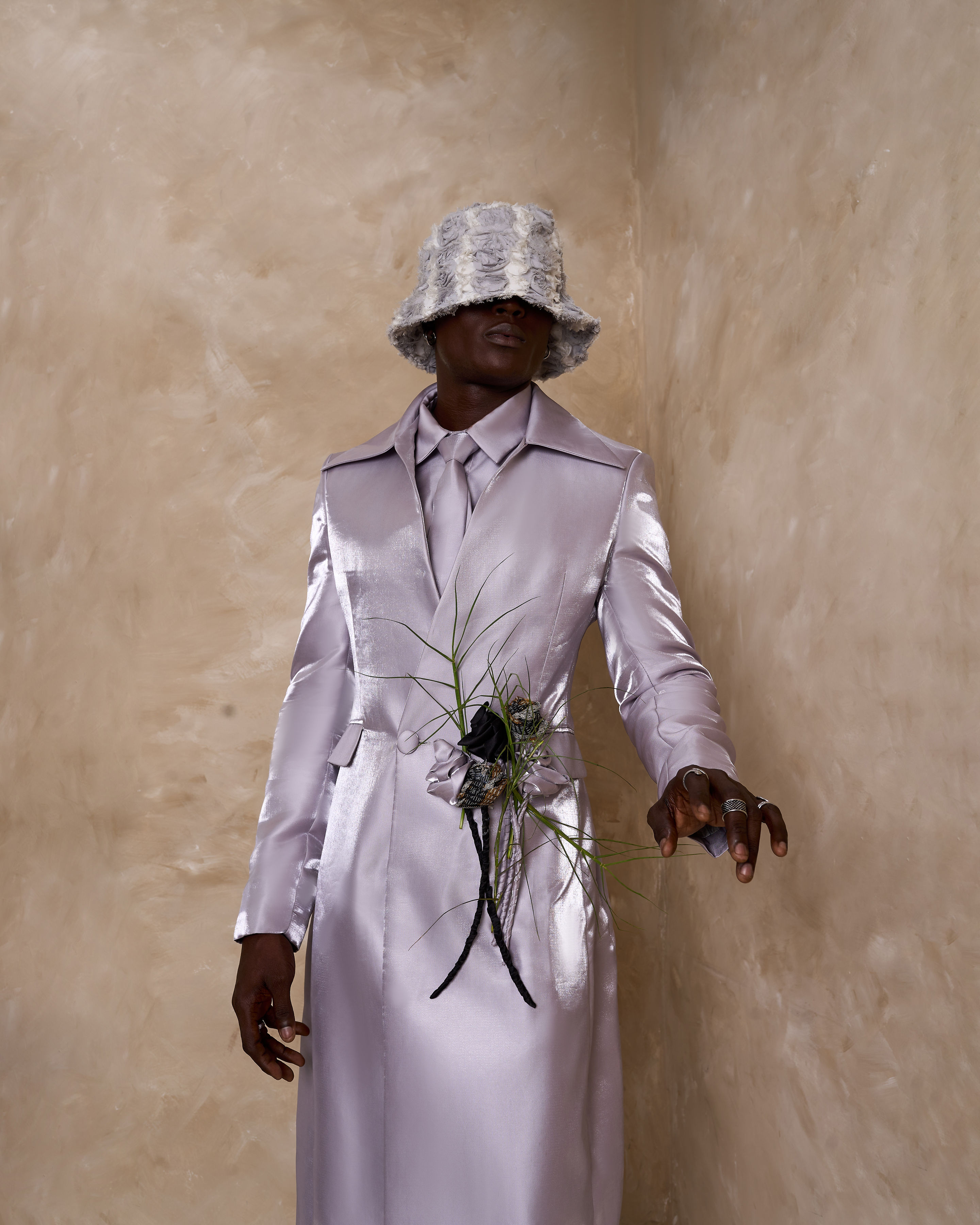 Monochrome full lenght double breasted trench coat, designed with a 3 piece handmade rose bouquet & long thin leaves. Sleeveless inner shirt, tie and pant.
