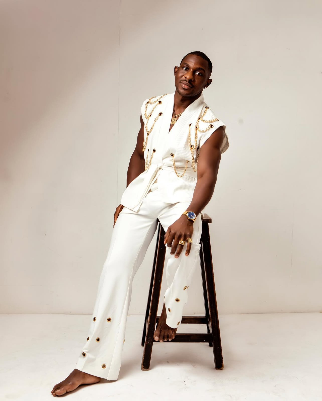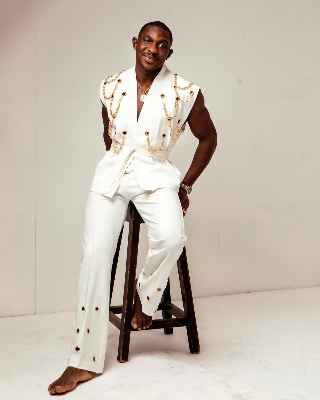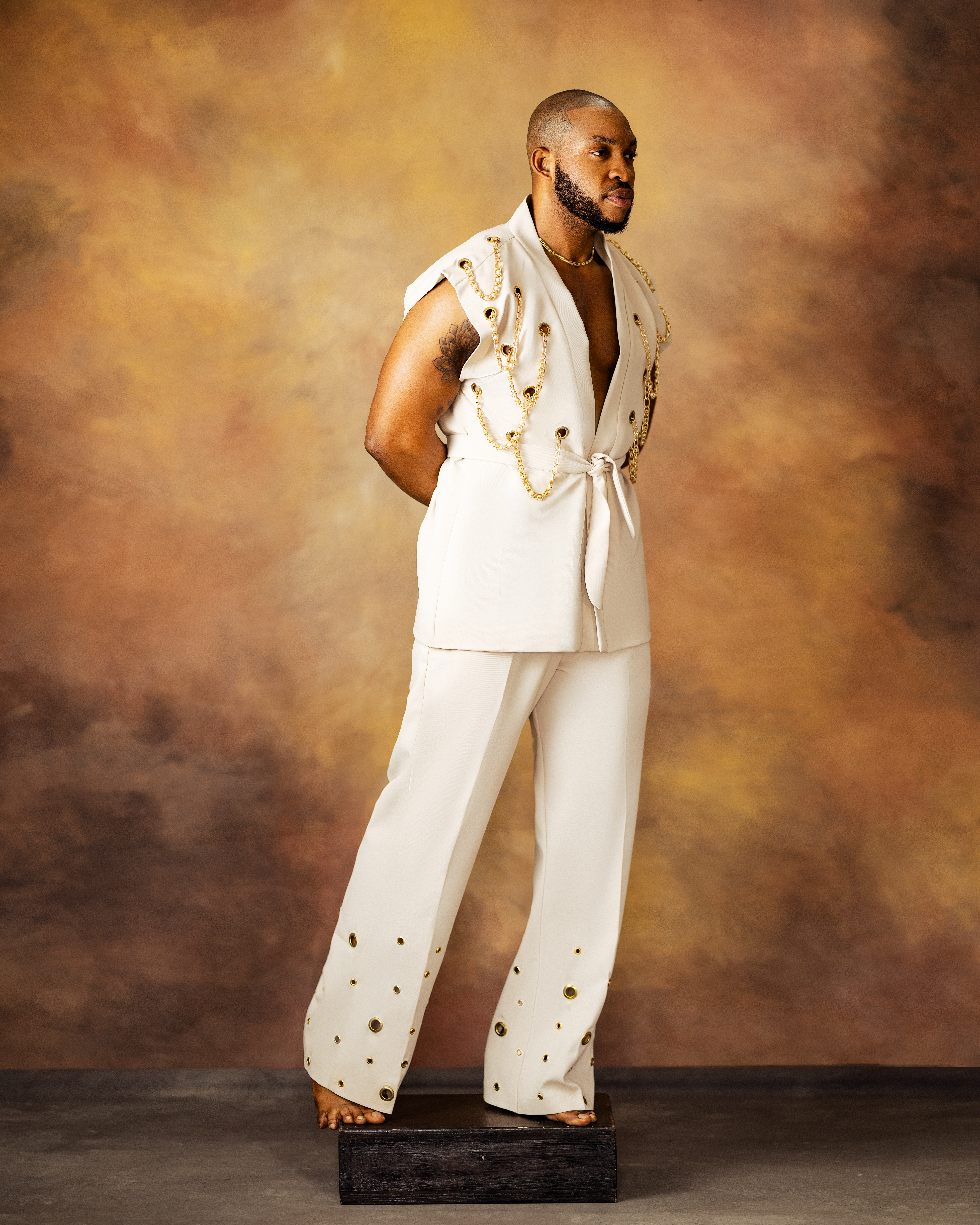 A sleeveless samurai jacket carefully created to detailing with gold chains passed across gold steel eyelets forming a ‘U’ shape across parts of the jacket. Paired with a hybrid straight pant designed with eyelet details at the bottom.