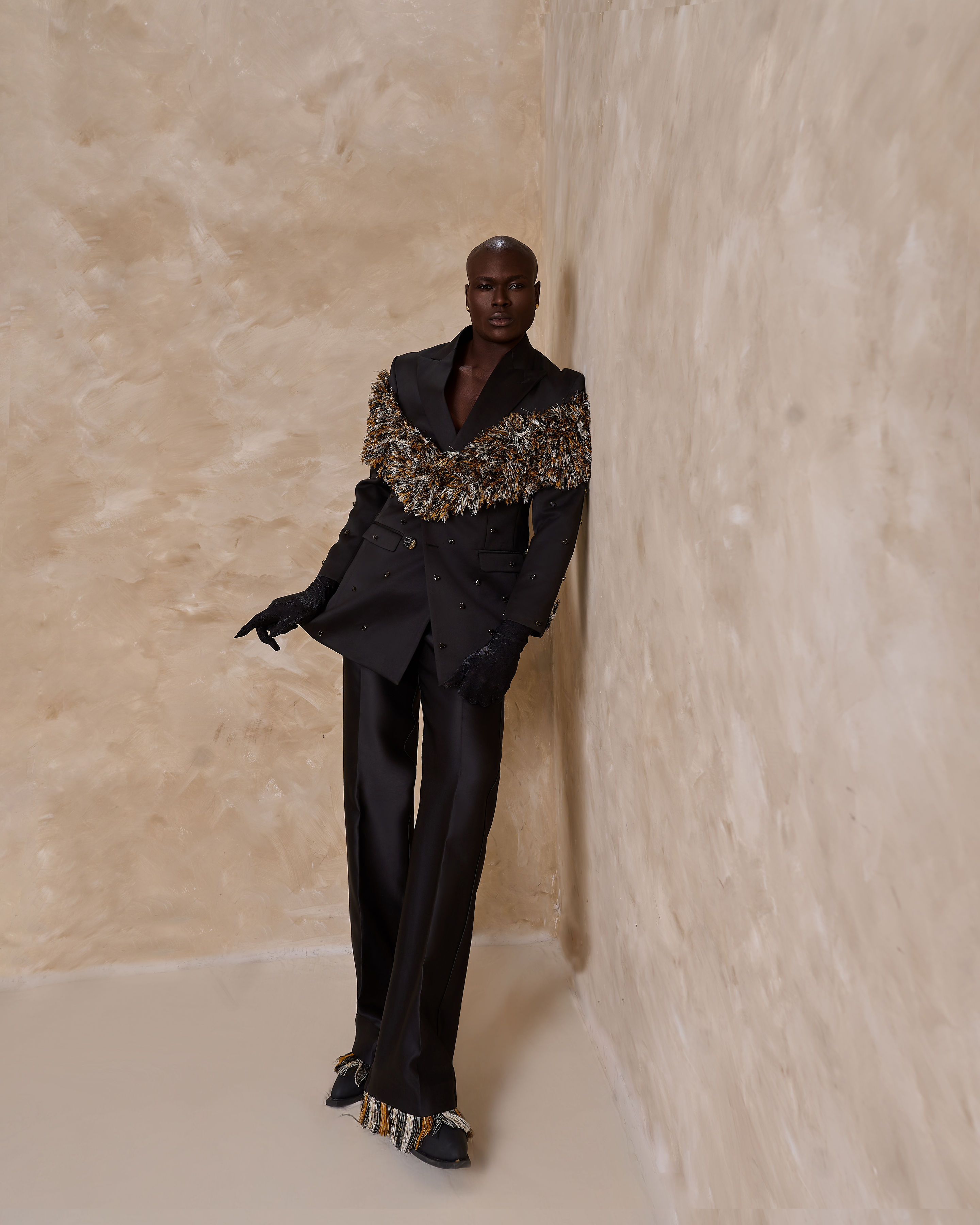 Double breasted peak lapel jacket with fur design made of asooke accentuating a V cut from the upper shoulder to the mid point of the jacket. Matching pant and asooke fringe helm.