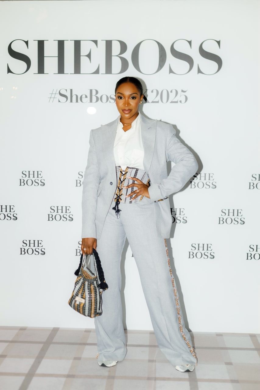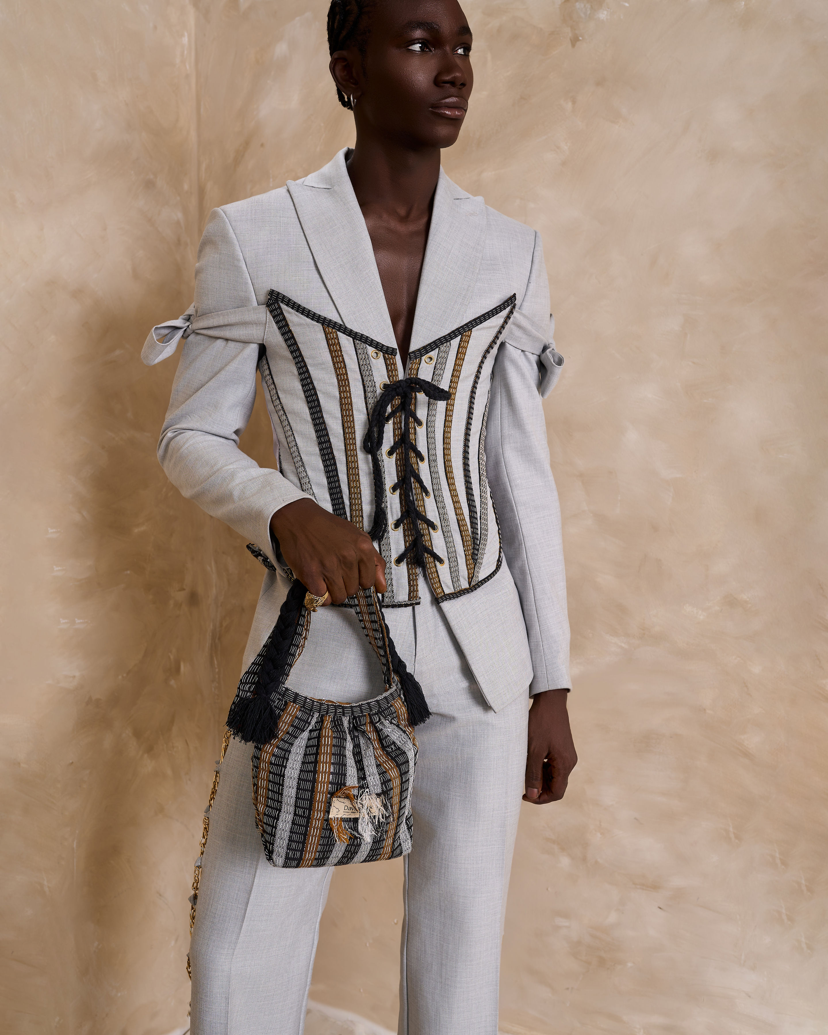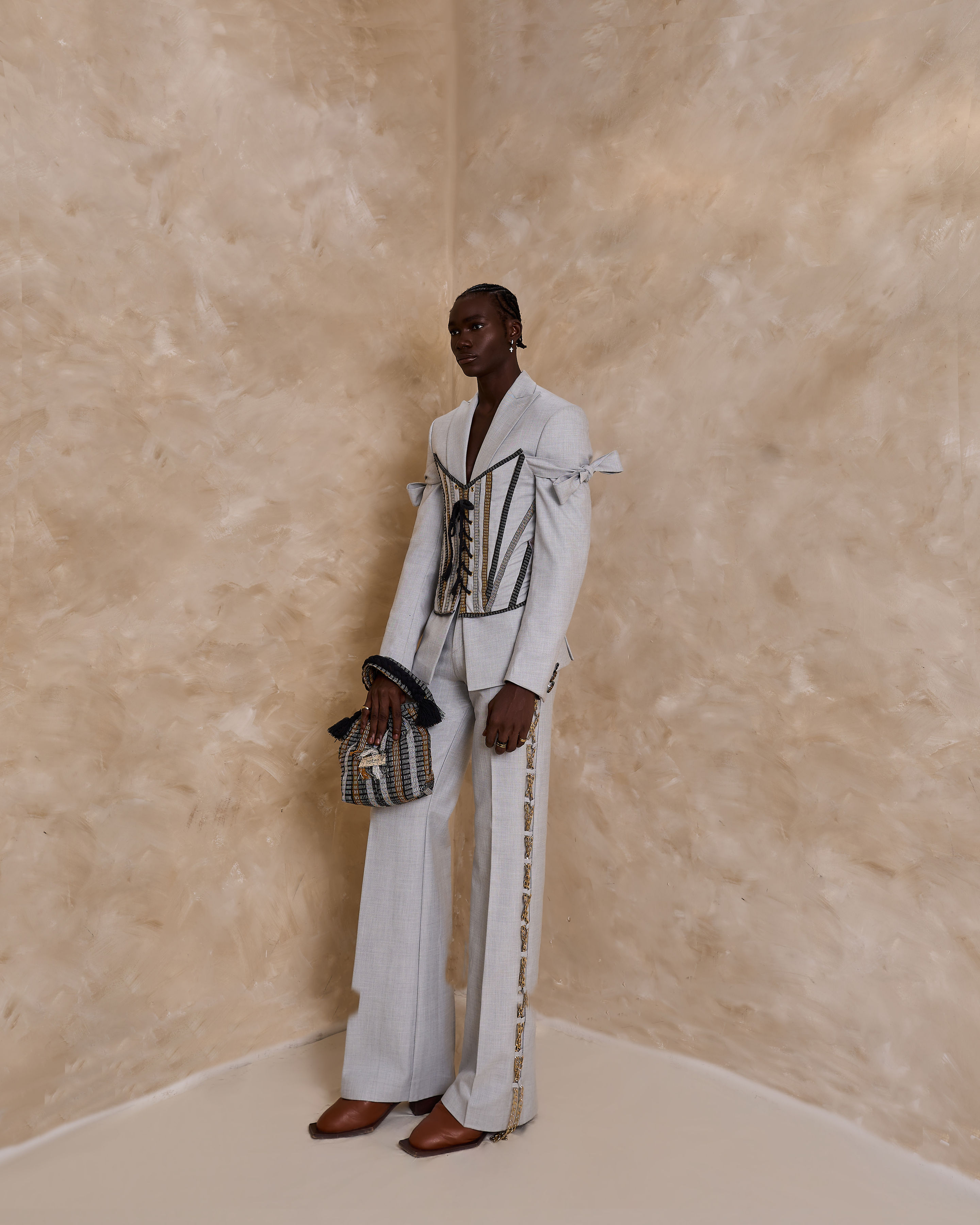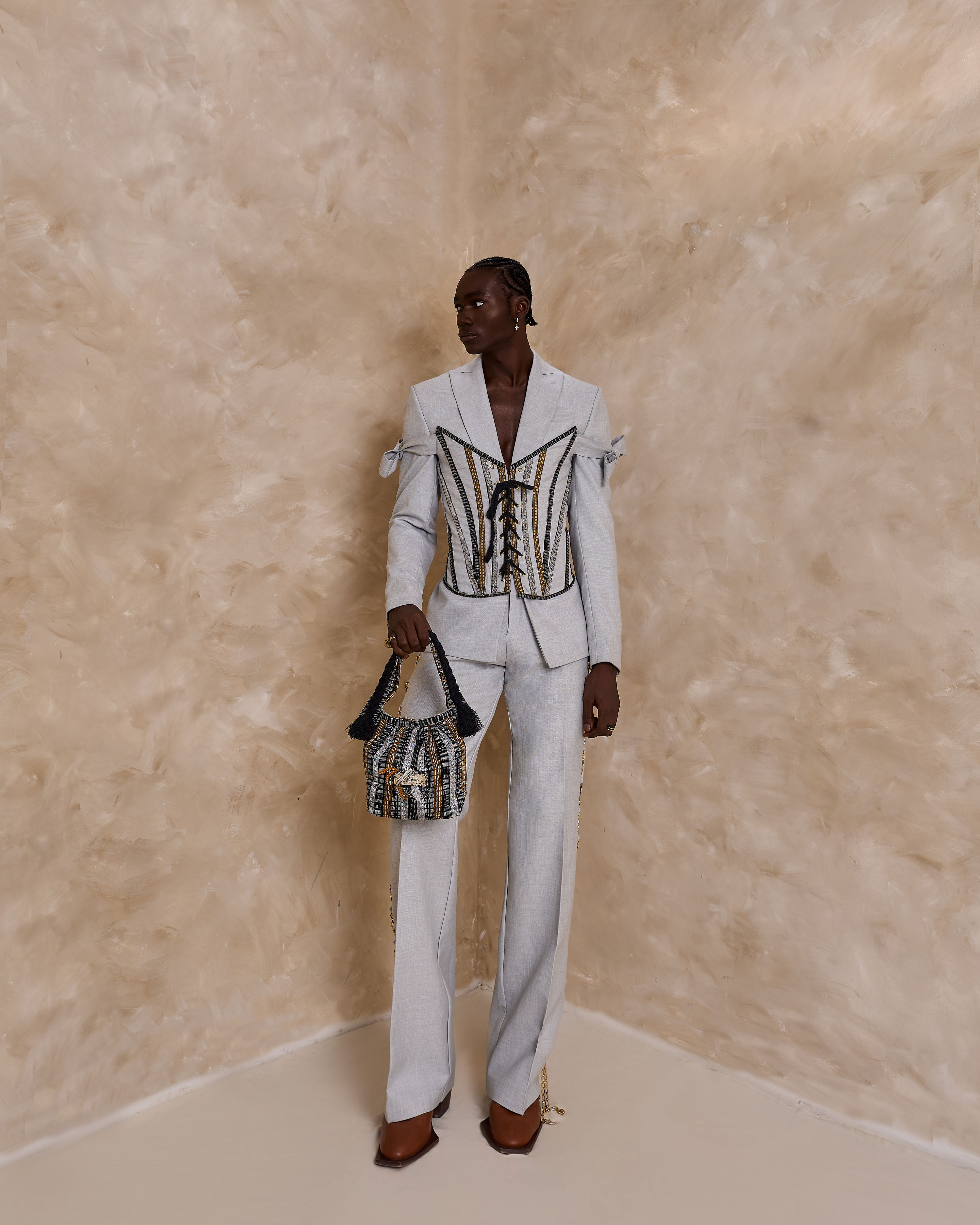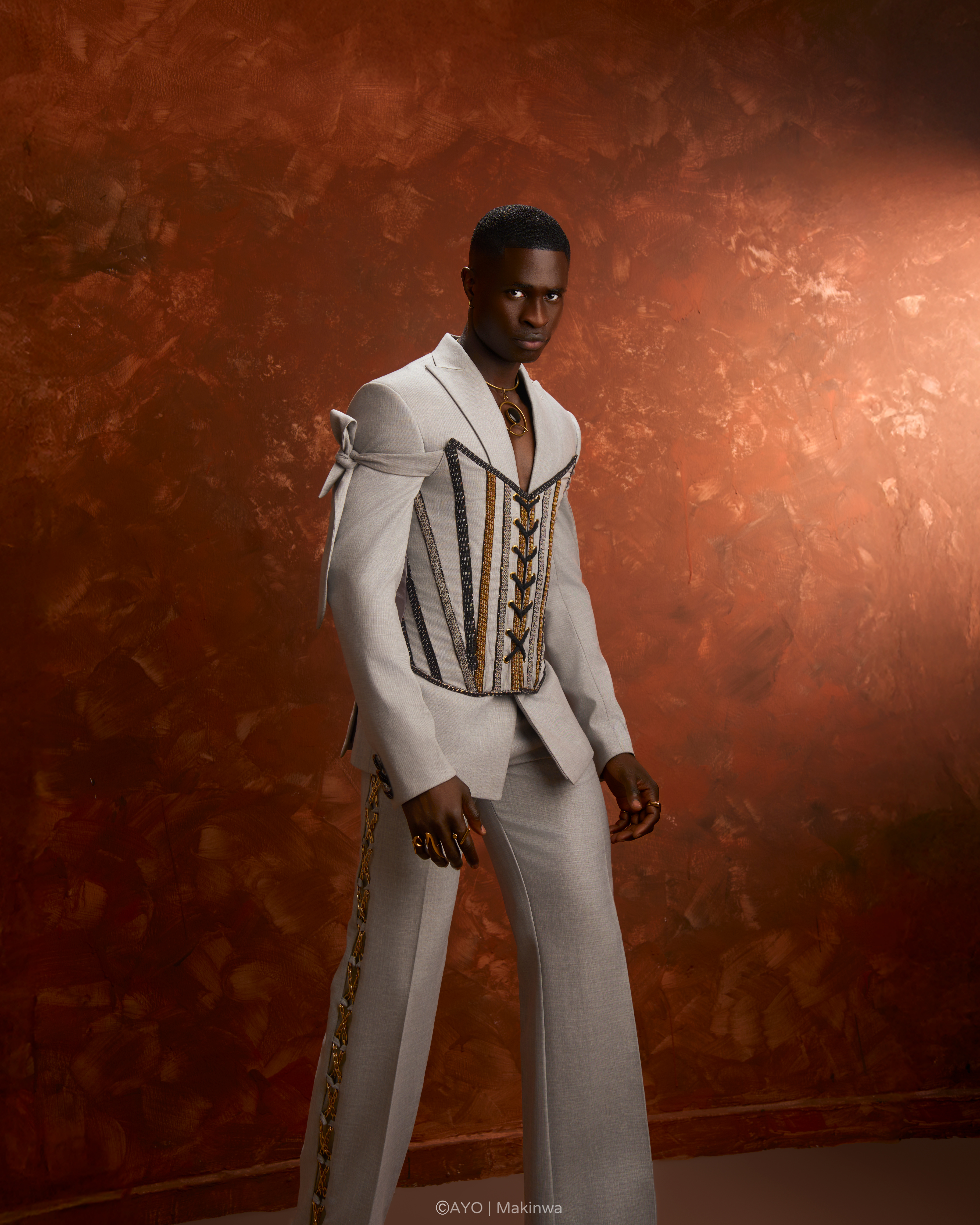 Single button peaked wide lapel suit, adjustable corset with asooke lines, matching pant with our signature cris-cross chain pant detail.
