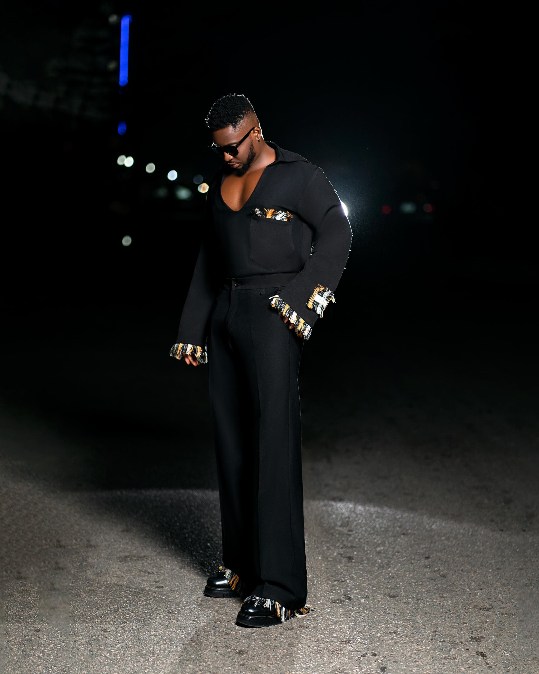 Loose fit shirt with collared V-neck, an over length sleeves and our signature dB label on asooke finished with asooke fringes on the helm of the sleeves. Matching hybrid wide leg pant finished with Asooke fringe at the helm.