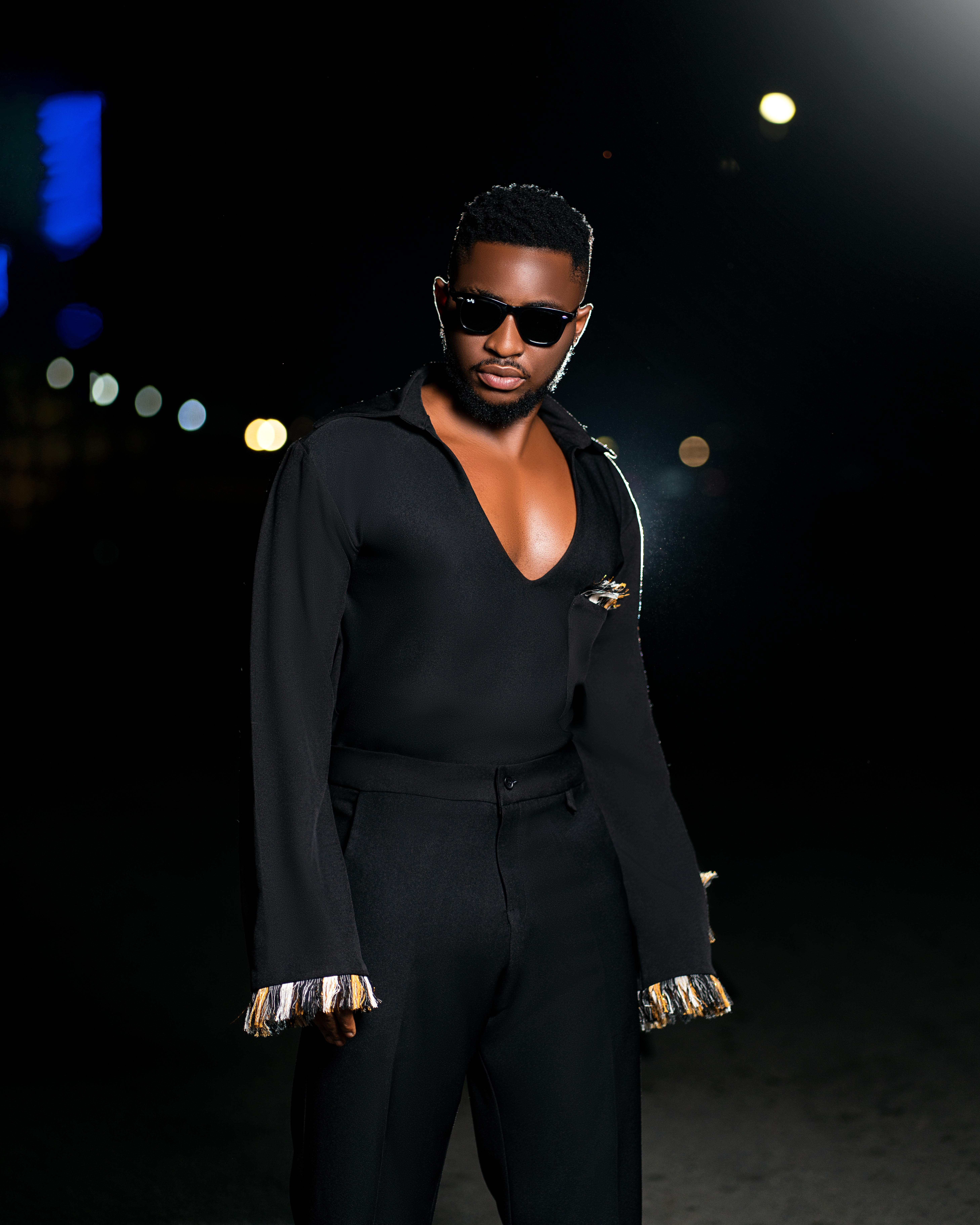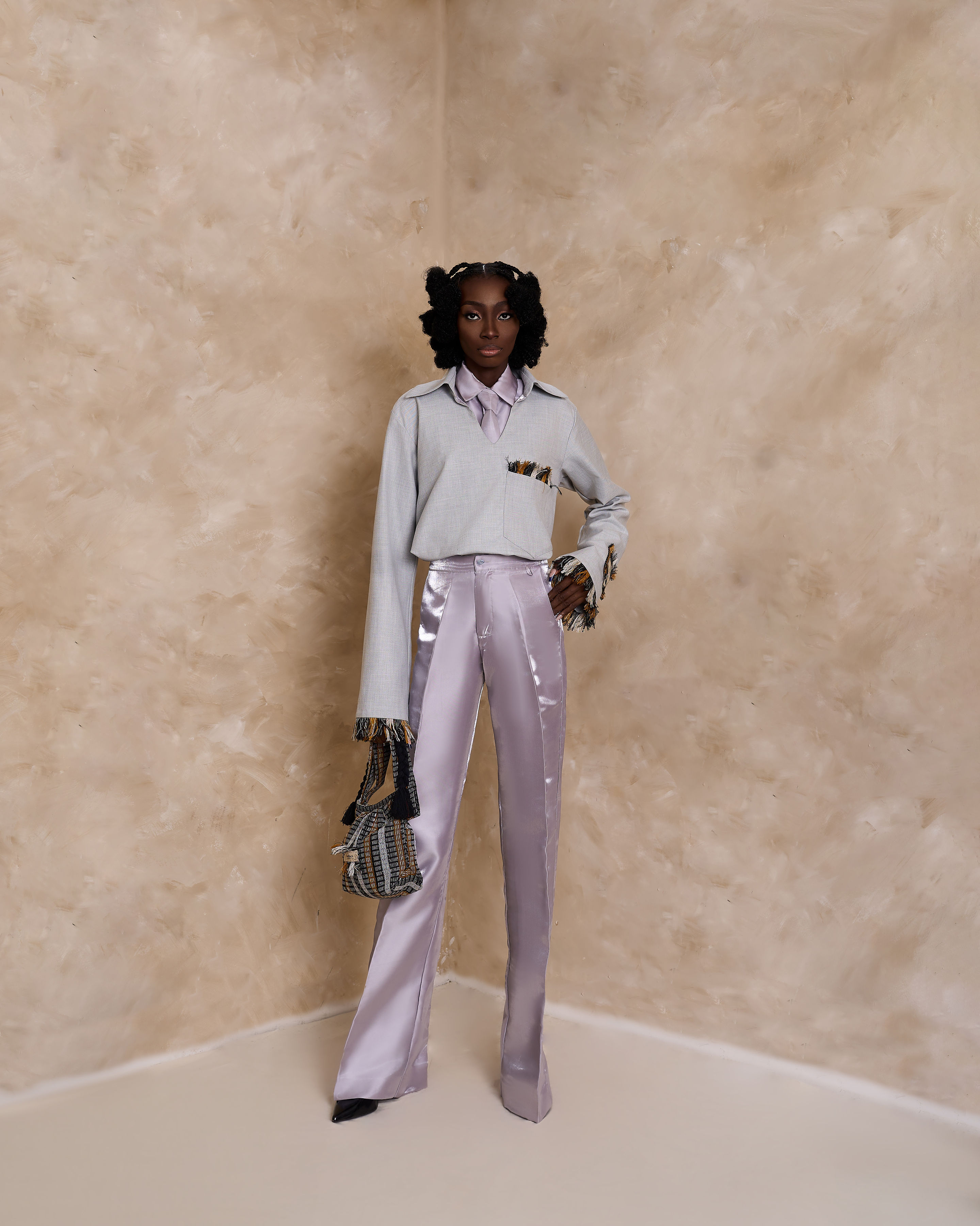 Loose fit shirt with collared V-neck, breast pocket with asooke fringe, an over length sleeves and our signature dB label on asooke finished with asooke fringes on the helm of the sleeves.